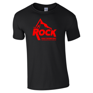 Gildan Softstyle tshirts with “THE ROCK” logo printed in red on the front!